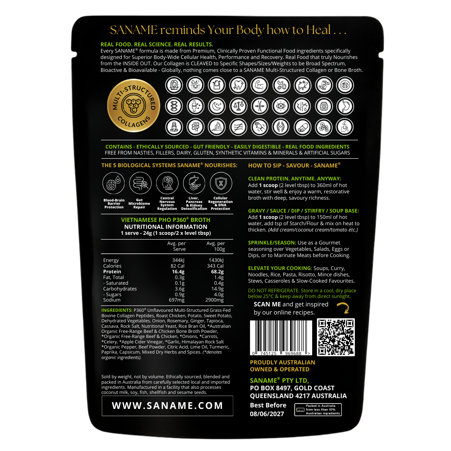 SANAME, an Australian-owned and operated Premium Practitioner Grade Multi-Structured Collagen & Bone Broth Business. SANAME provides superior collagen and bone broth functional food that can be rehydrated into liquid functional food or incorporated into cooking and baking. These innovative products hold unlimited potential to reshape global health, particularly in addressing malabsorption, malnutrition, and diseases linked to glutathione deficiencies. We have done all the hard work in the kitchen – you just boil the kettle then Tip, Stir, Sip, Savour, Saname… or Sprinkle/Simmer/Soak/StirFry/ over Salad/Vege/Meat … endless possibilities