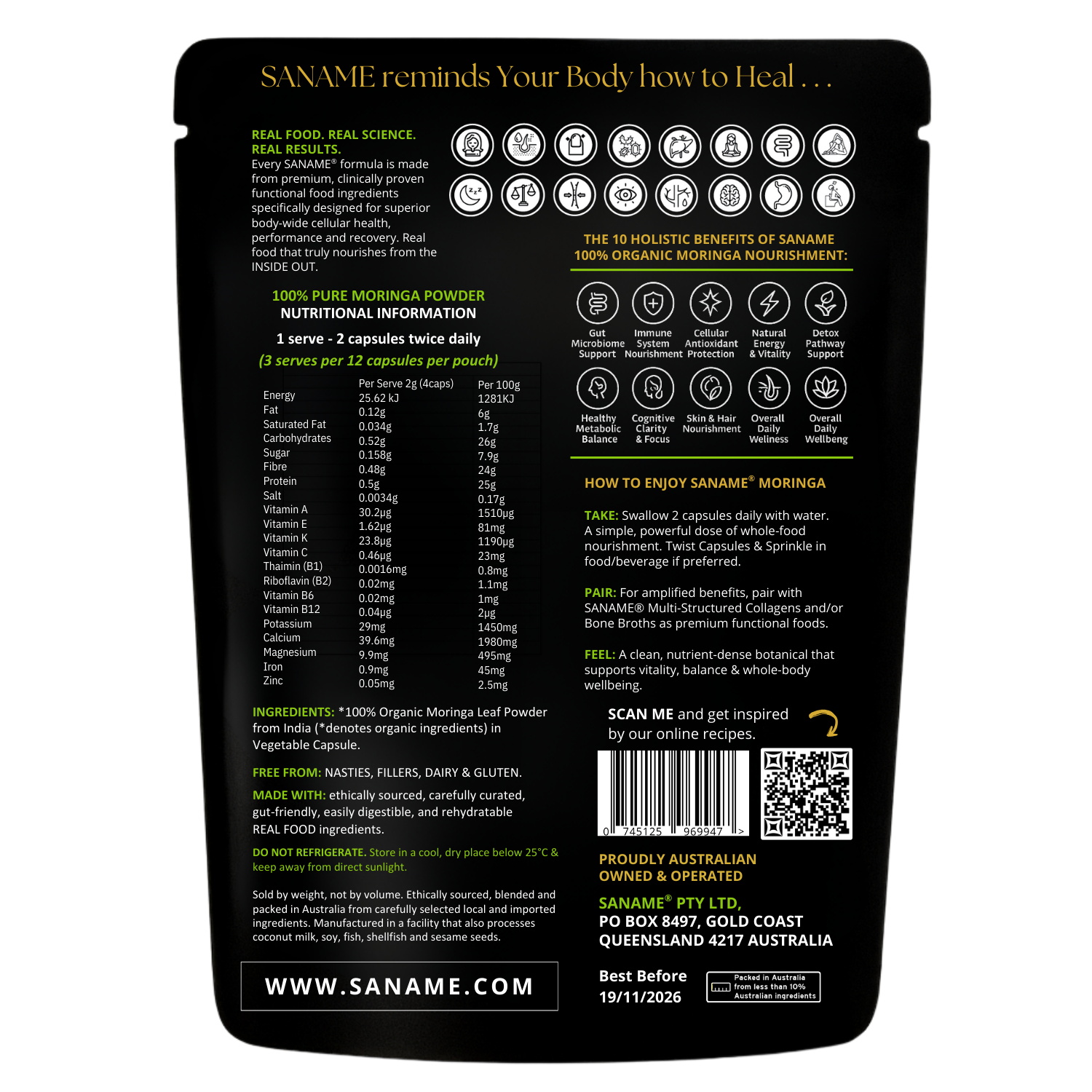 SANAME 100% Pure Moringa Leaf Powder Capsules harness the full-spectrum power of this ancient superfood in a clean, convenient, food-based capsule — delivering uncompromising purity, potency, and bioavailability.