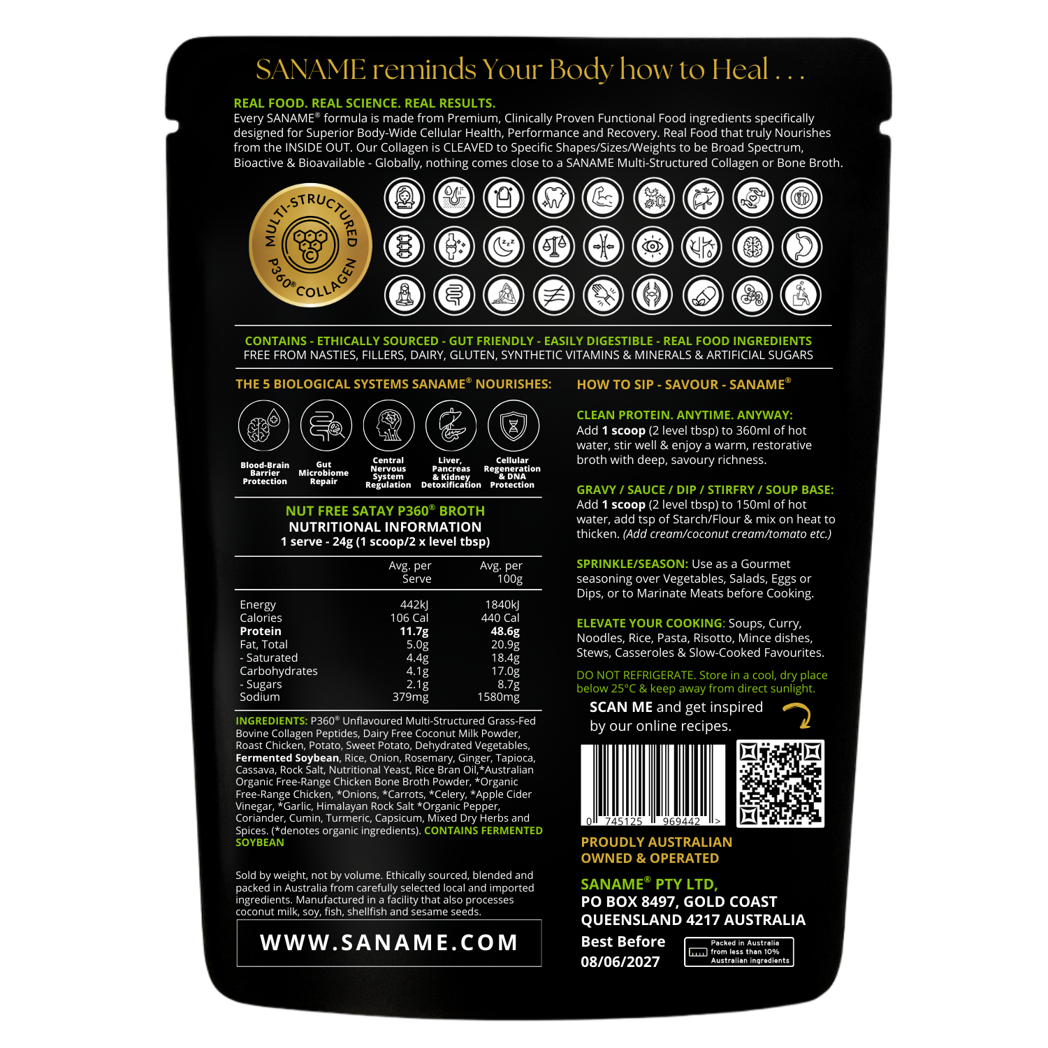 SANAME P360™ Spicy Nut-Free Satay Multi-Collagen Bone Broth is a high-protein, low-carb liquid functional food that feels like a "Hug in a Mug," awakening your taste buds and senses with every sip. Enjoy it as a comforting hot beverage, or elevate your meals by using it as a sprinkle or seasoning! Simply mix it into vegetables, salads, meats, dips, and soups, or enhance your favourite recipes instantly for a deep umami flavour with unparalleled nutritional benefits.